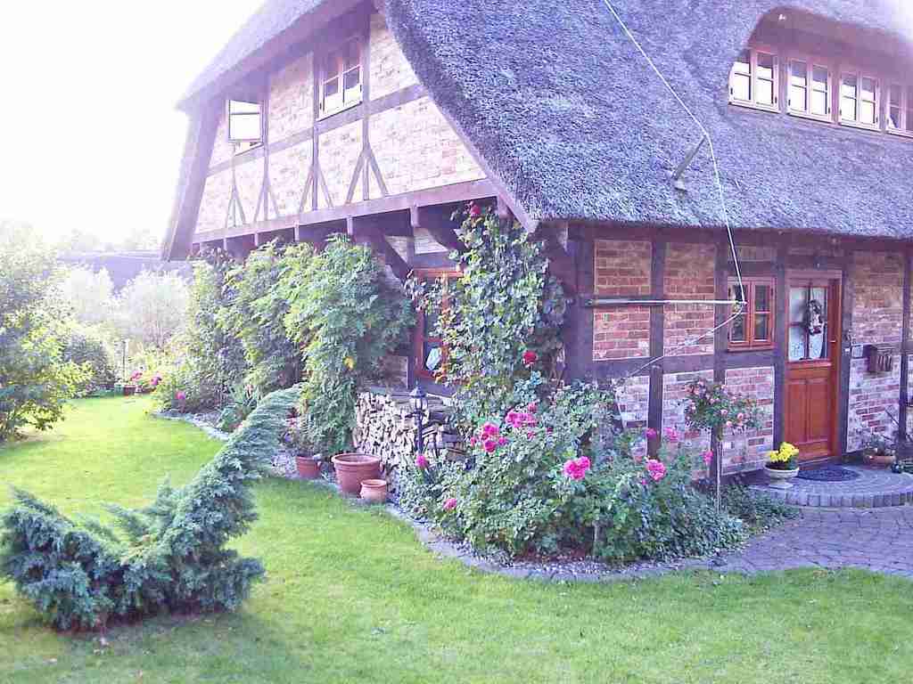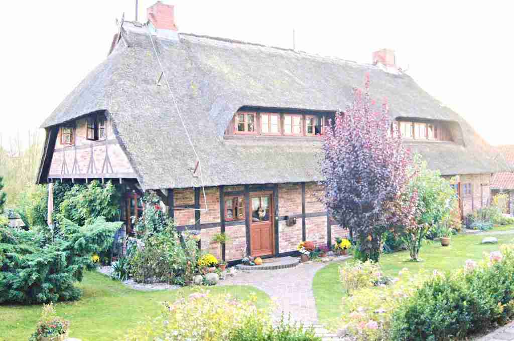 Diese Immobilie wurde 1996 in massiver Bauweise erbaut. Für das besondere Ambiente sorgt hier das Fachwerk sowie das Reetdach (hier wurde der First im Jahre 2012 neu gedeckt). Das Fachwerk mit Eichenbalken und der alte Backstein verleihen diesem Haus seinen besonderen Charme.