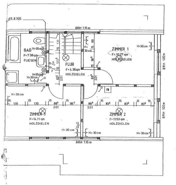 Im Erdgeschoss sind die Böden gefliest. Im Obergeschoss sind die Schlafräume sowie der Flur mit Holzdielen versehen. Das Vollbad ist ebenfalls gefliest.