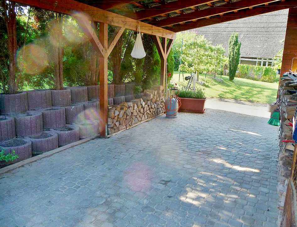 Besonders erwähnenswerte am Grundstück ist, dass es bereits vollständig eingefriedet ist mit Hecken, Zaun und schmiedeeisernen Pforten. Ein schöner Obstgarten ziert das zum Entschleunigen einladende Grundstück. Ein Eyecatcher ist hier die massive Gartenschaukel aus Eiche, die mit Reet aus Südafrika gedeckt ist, hier kann man herrlich entspannen.