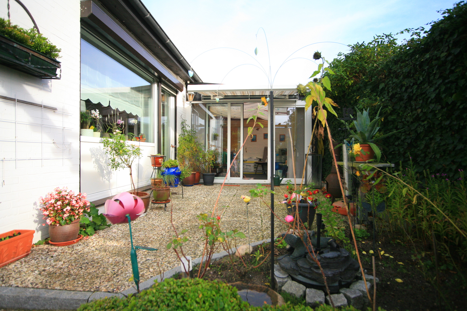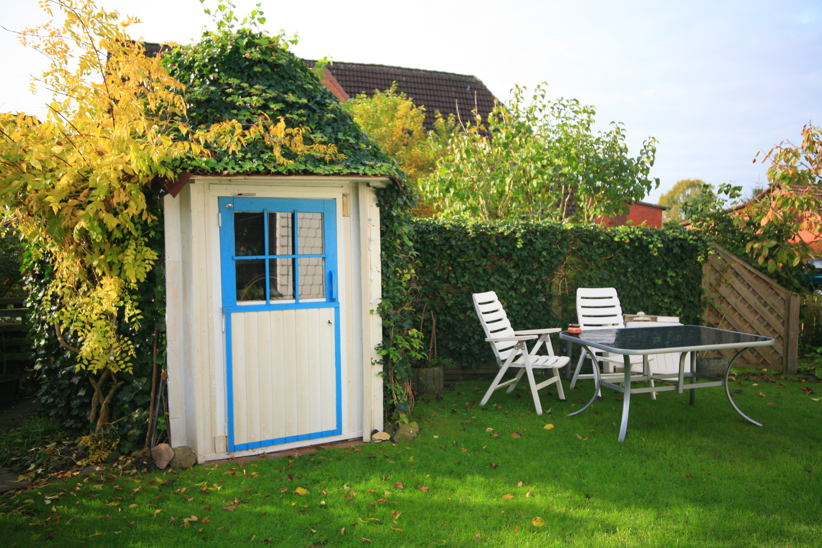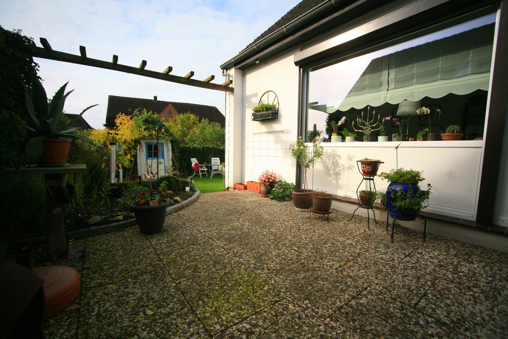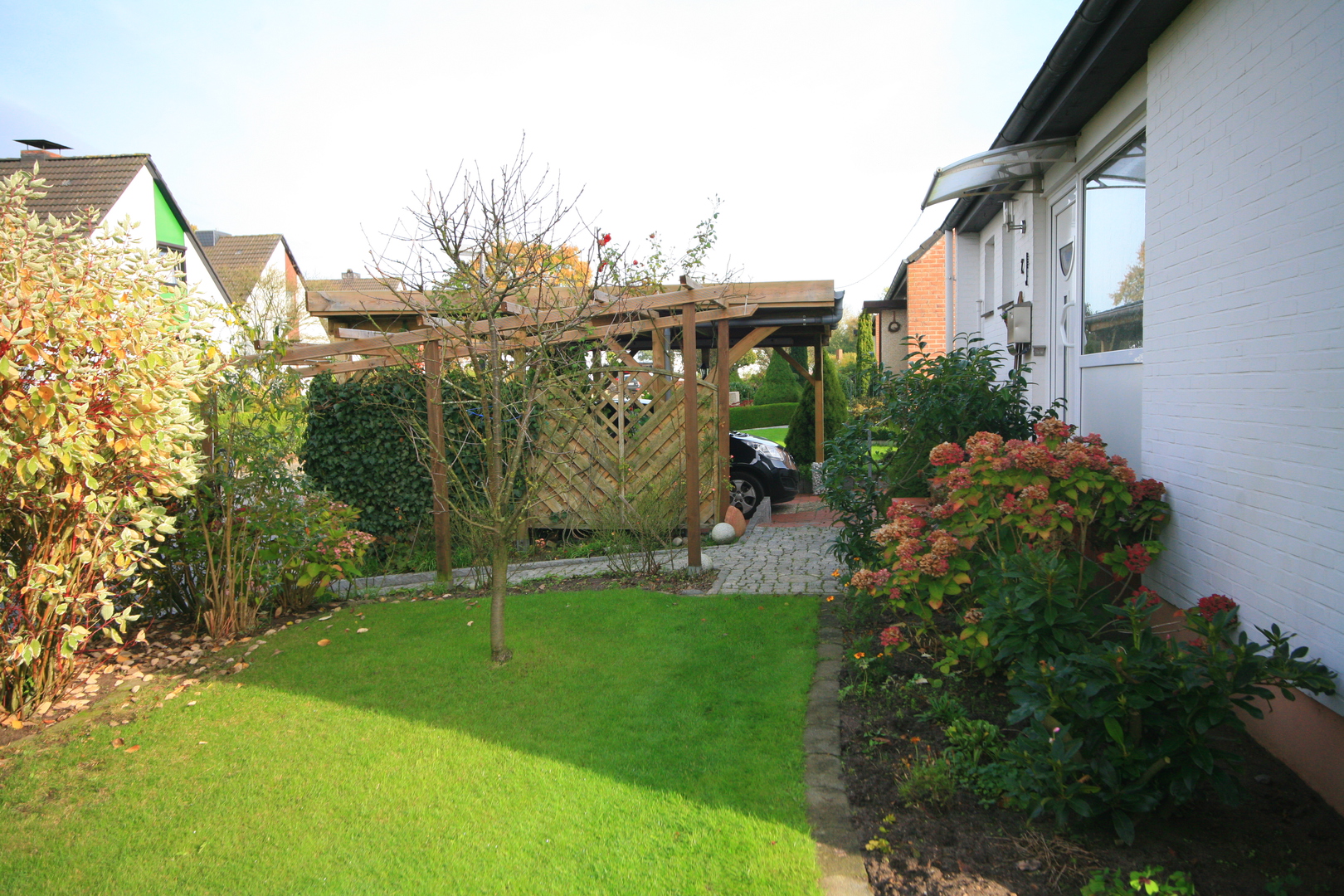 Der Garten ist pflegeleicht und idyllisch angelegt. Hier steht Ihnen ein Gartenpavilion als Unterstellmöglichkeit für z.B. Ihre Gartenmöbel zur Verfügung.