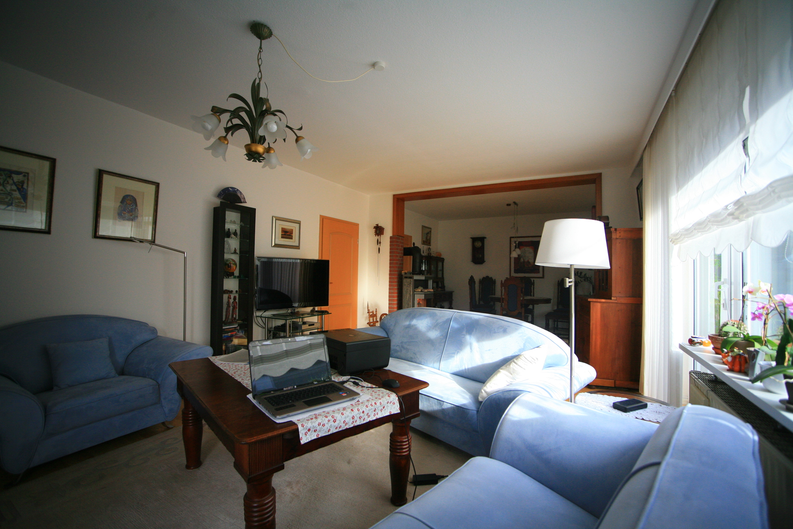 Ebenfalls vom Flur erreichbar das Wohn- und Esszimmer mit Zutritt in den Wintergarten und hinaus auf die Terrasse, diese ist mit einer Markise zu beschatten. Der Wohn- und Essbereich ist großzügig gestaltet und bietet Ihnen einen schönen Kaminofen (Speckstein) für romantische Stunden mit Blick auf das lodernde Feuer.