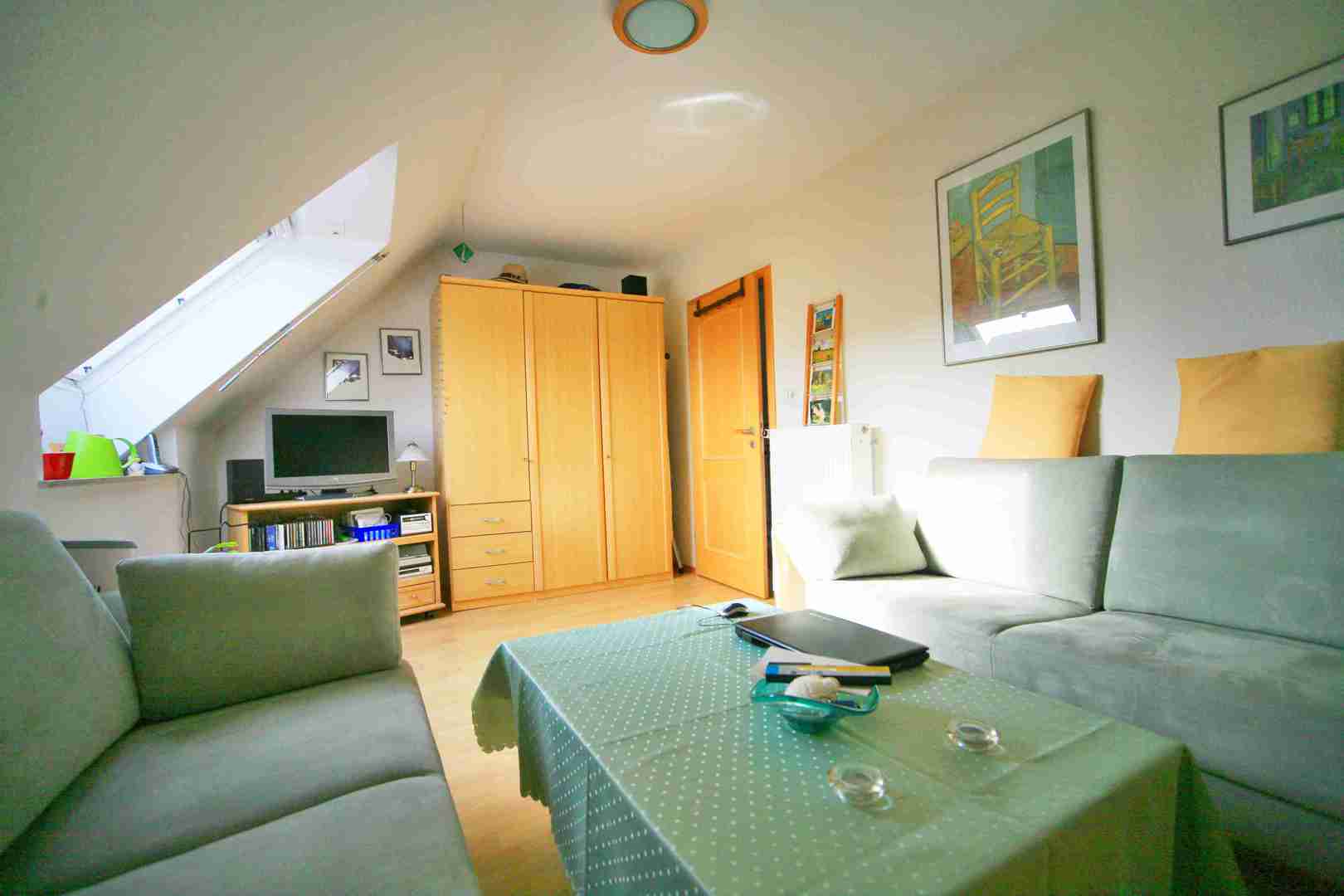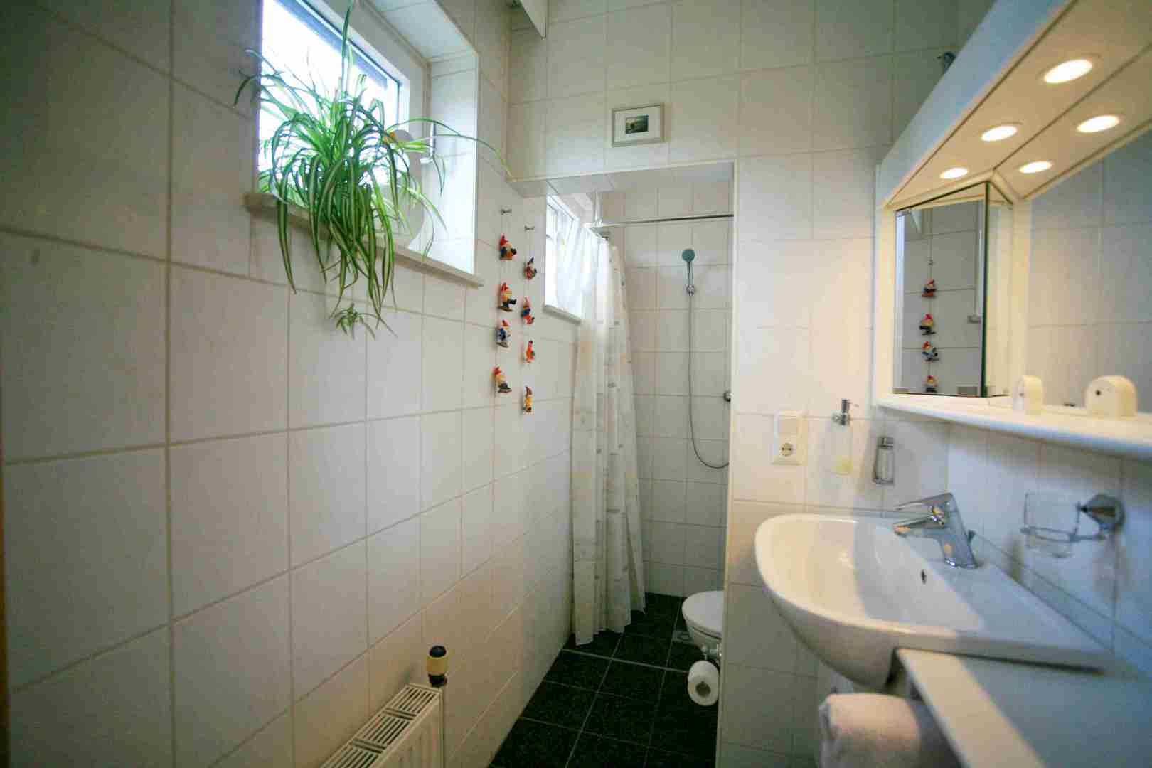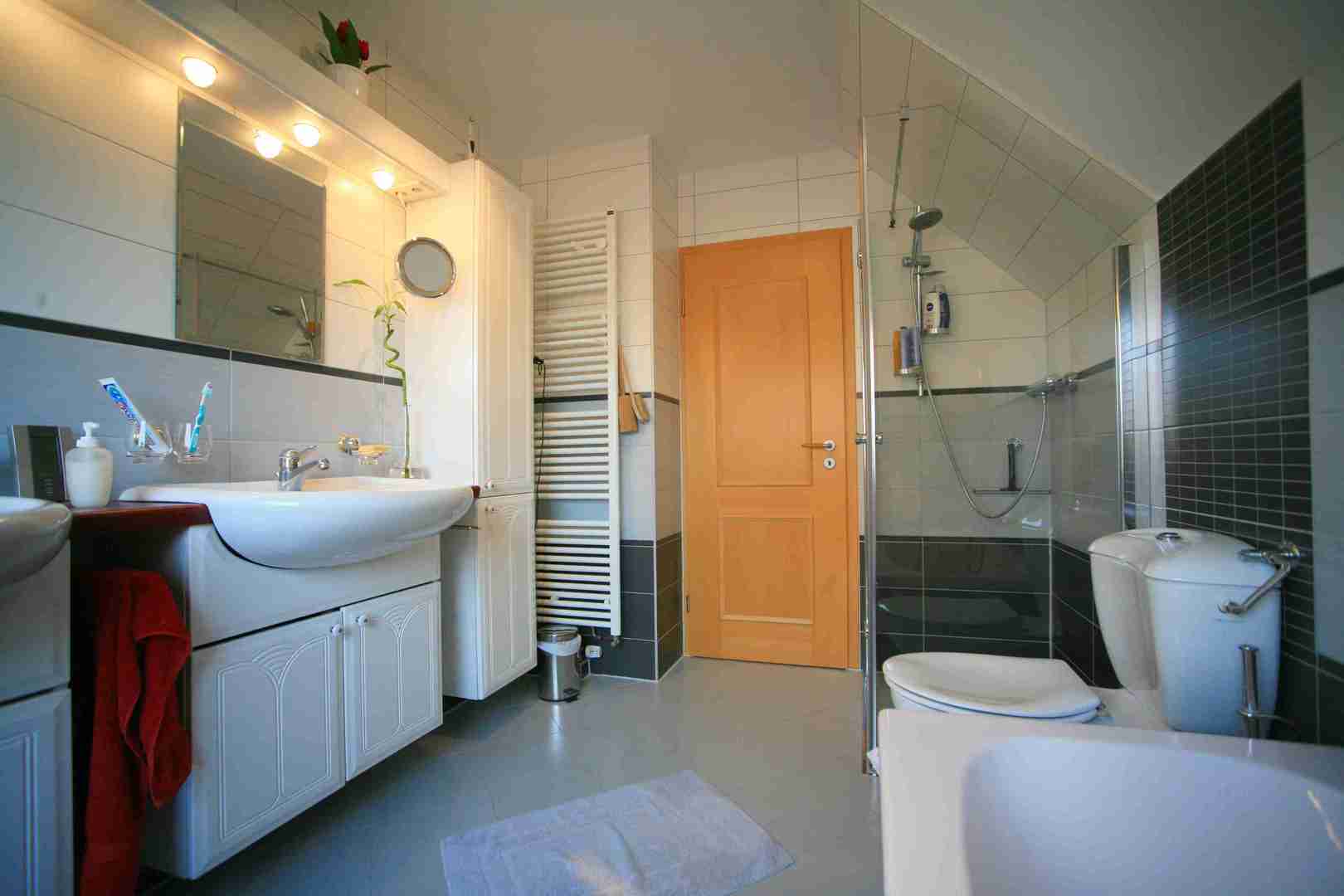 Zur rechten Seite geleitet Sie eine schöne Treppe mit Echtholz- Trittstufen in das Dachgeschoss. Zur linken Seite befindet sich das Gäste- WC mit Dusche in modernem Design.