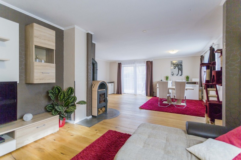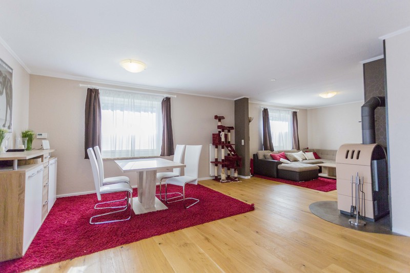 Der geräumige und lichtdurchflutete Wohnraum ist mit einem doppelflügigen Terrassenelement ausgestattet und gibt Ihnen den Weg auf die schöne Süd-Terrasse und den Garten frei. Die Terrasse lädt zum Verweilen ein und ist durch eine Markise zu beschatten. Im Wohn- und Essbereich sorgt ein klasse Kaminofen an kalten Tagen für romantische Stimmung mit wohliger Wärme.