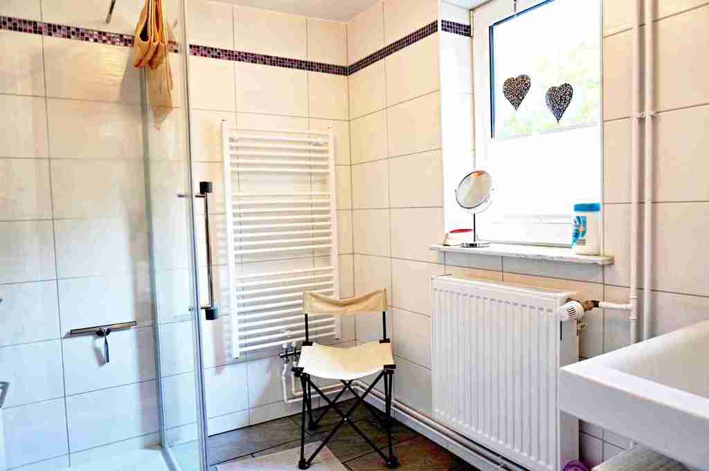 Das Duschbad im Erdgeschoss ist modern gestaltet und ebenfalls neuwertig. Ein Handtuchheizkörper ist vorhanden.
