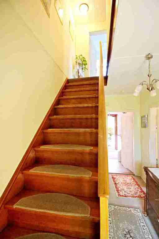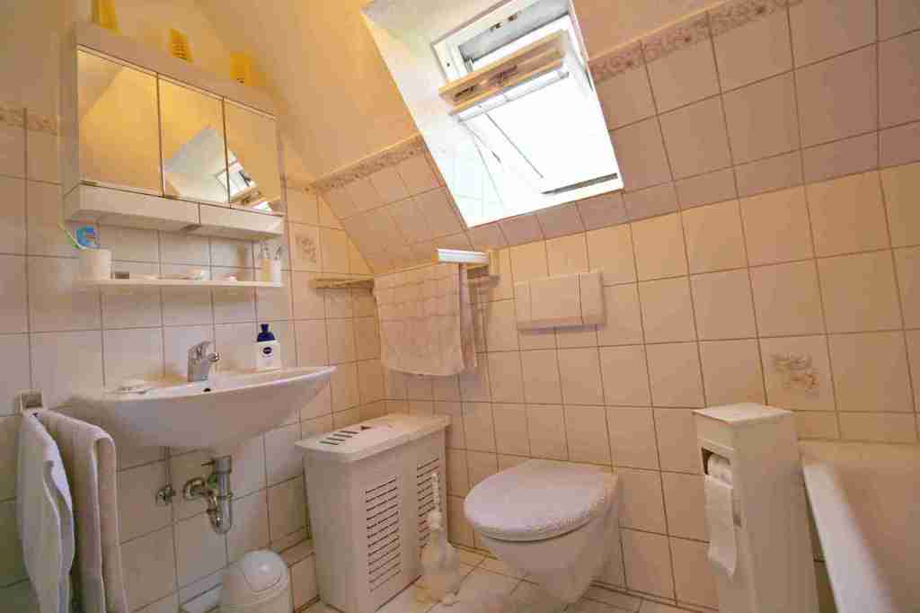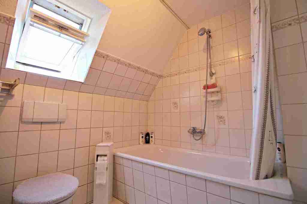Die elegante Holztreppe geleitet Sie in das Obergeschoss. Gerade durch befindet sich das Tageslicht – Badezimmer mit einer Badewanne, einem WC und einem Waschbecken ausgestattet.