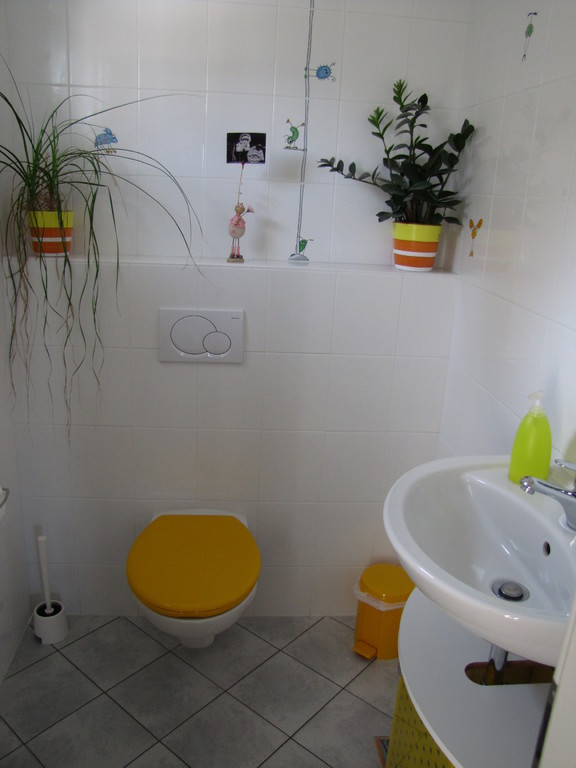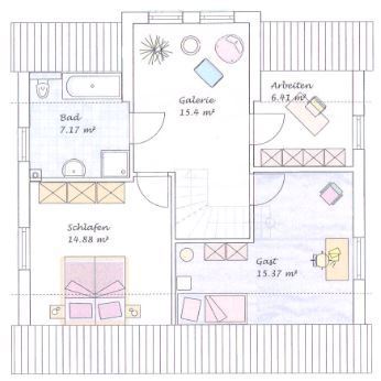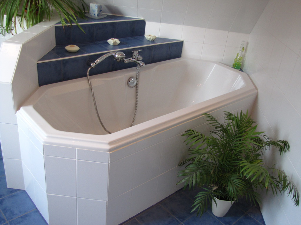 Im Dachgeschoss des Hauses erwarten Sie neben der Galerie ein geräumiges Vollbad in maritimen Blau- Weiß gehalten.