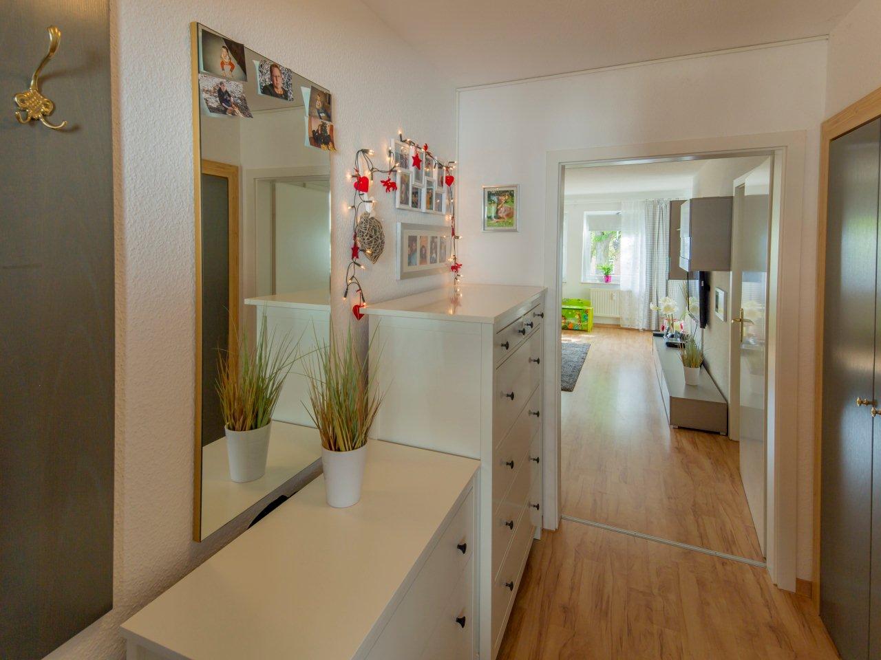 Sie betreten die schöne Wohnung und gelangen in den hellen Flur mit Platz für eine kleine Garderobe. Zur rechten Seite befindet sich das moderne Bad mit geräumiger Dusche und Tageslicht. Hier befindet sich sogar Platz für eine Waschmaschine und ggfl. Einen Trockner. Weiter entlang des Flures gelangen Sie in den behaglichen Wohnbereich mit ausreichend Raum für eine Sitzecke und einen separaten Essbereich. Zur linken Hand befindet sich die neue und moderne Küche, hier wird Kochen zum Genuß. Der Backofen befindet sich in praktischer Arbeitshöhe, ein Cerankochfeld und eine hochwertige Einbauspüle sind ebenfalls vorhanden.