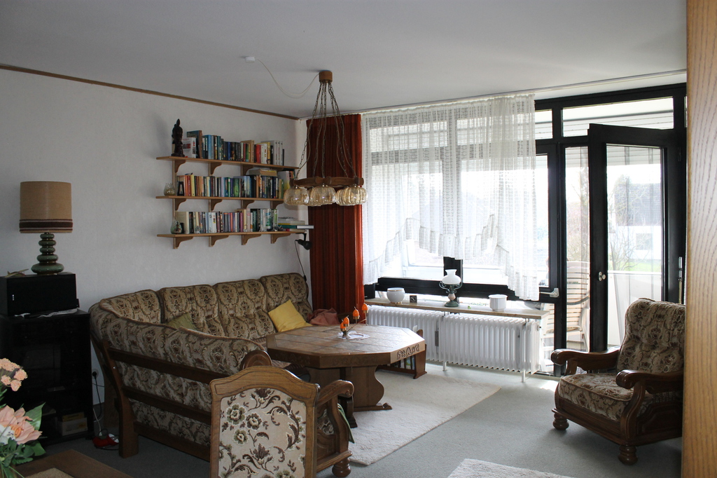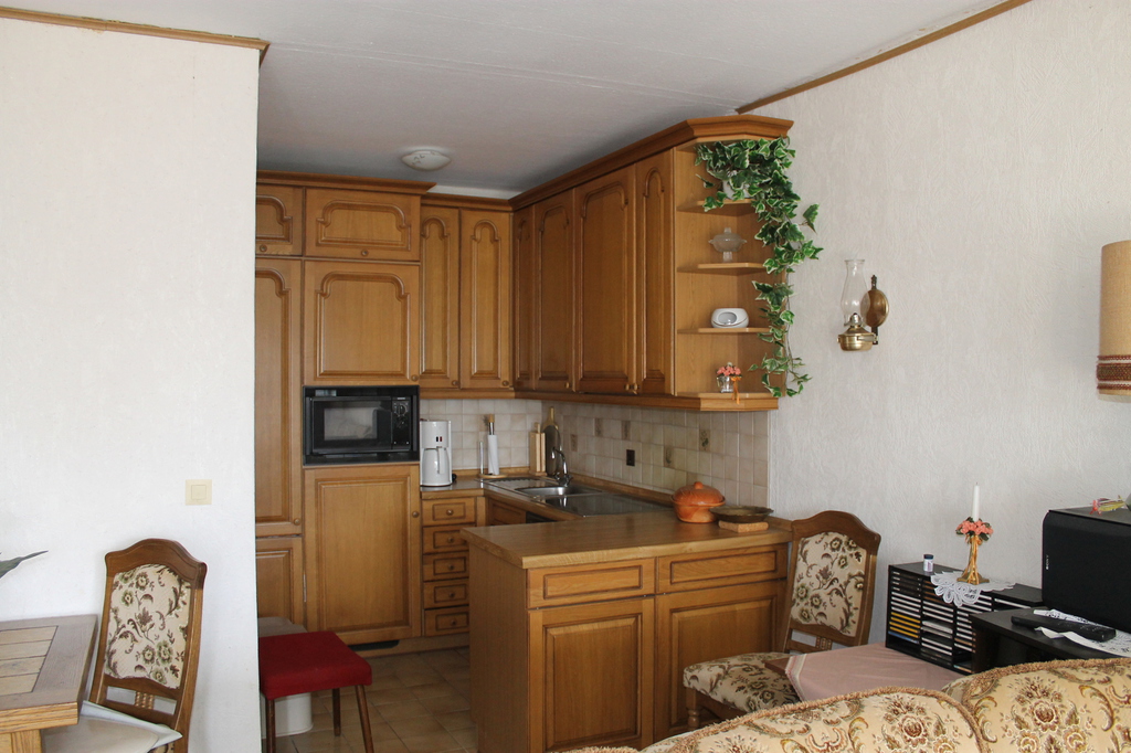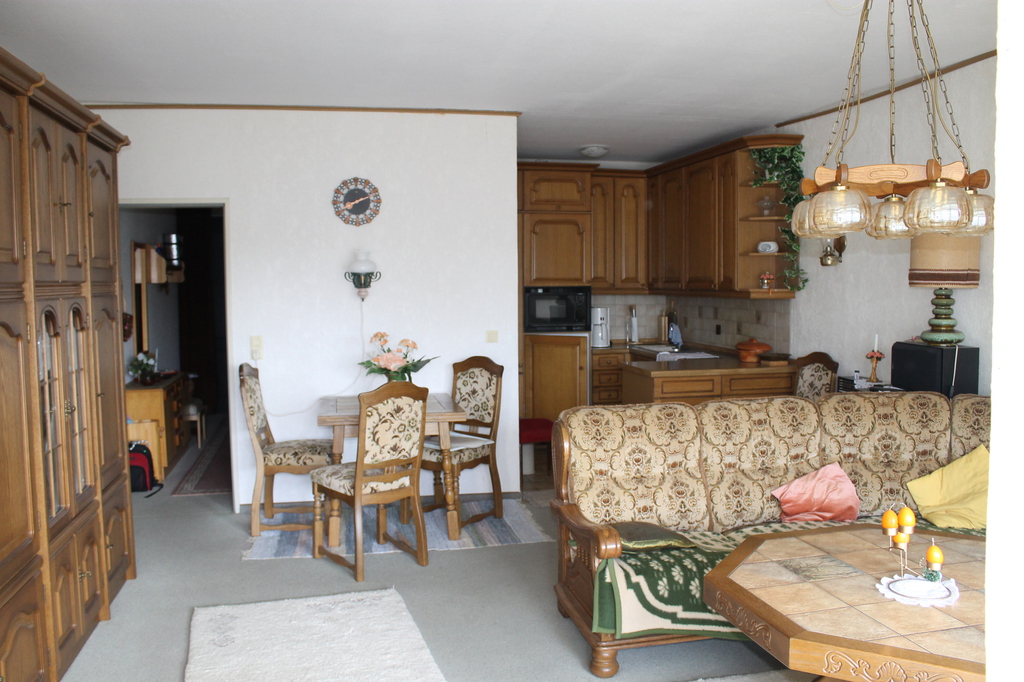 Das Wohnzimmer hat neben Couch und Schrankwand ausreichend Platz für einen Essplatz. Eine Einbauküche ist ebenfalls vorhanden.